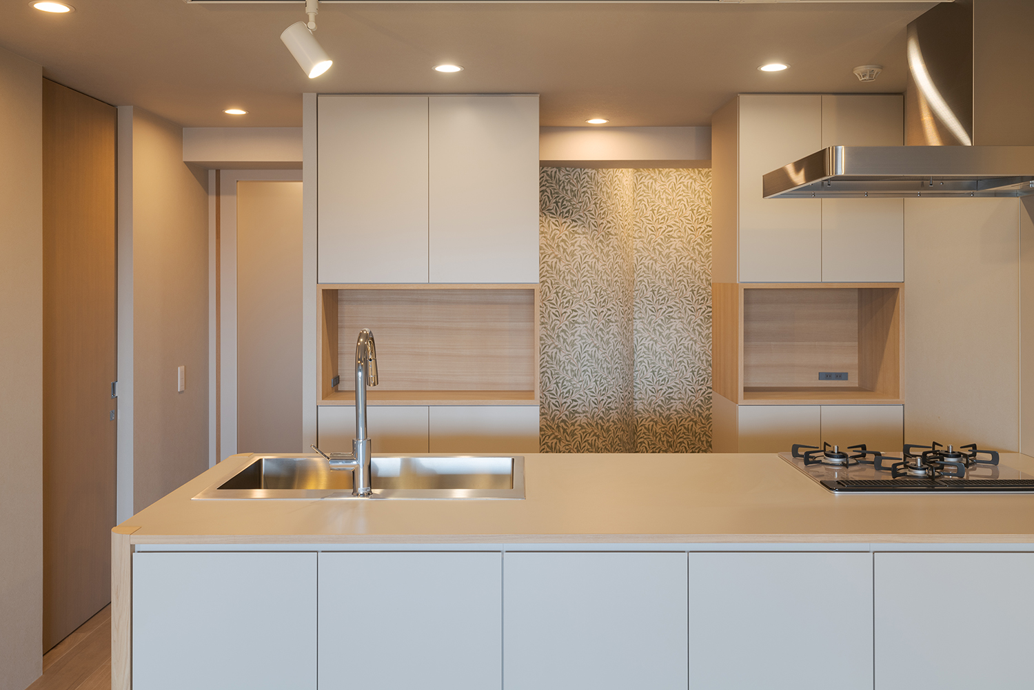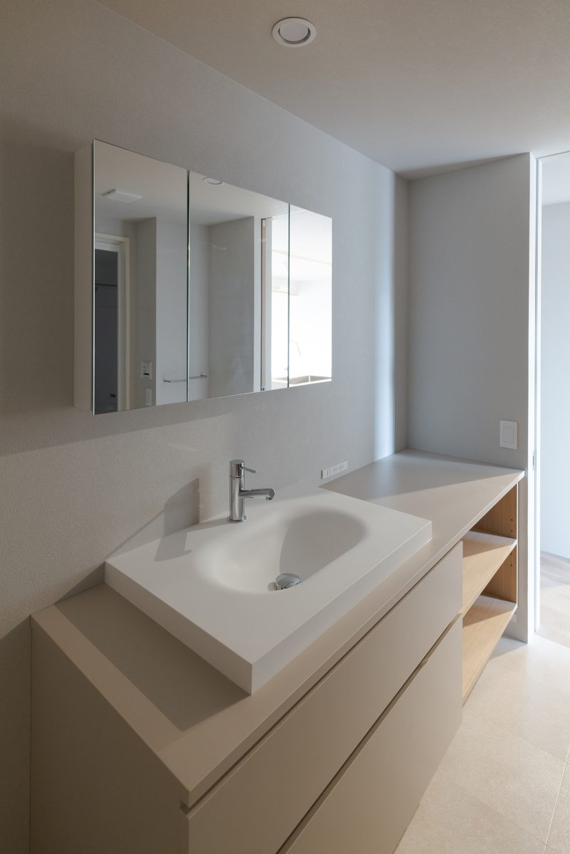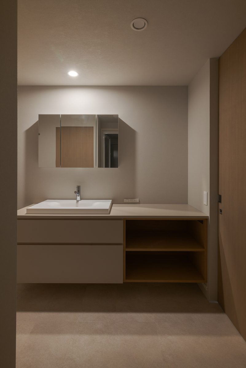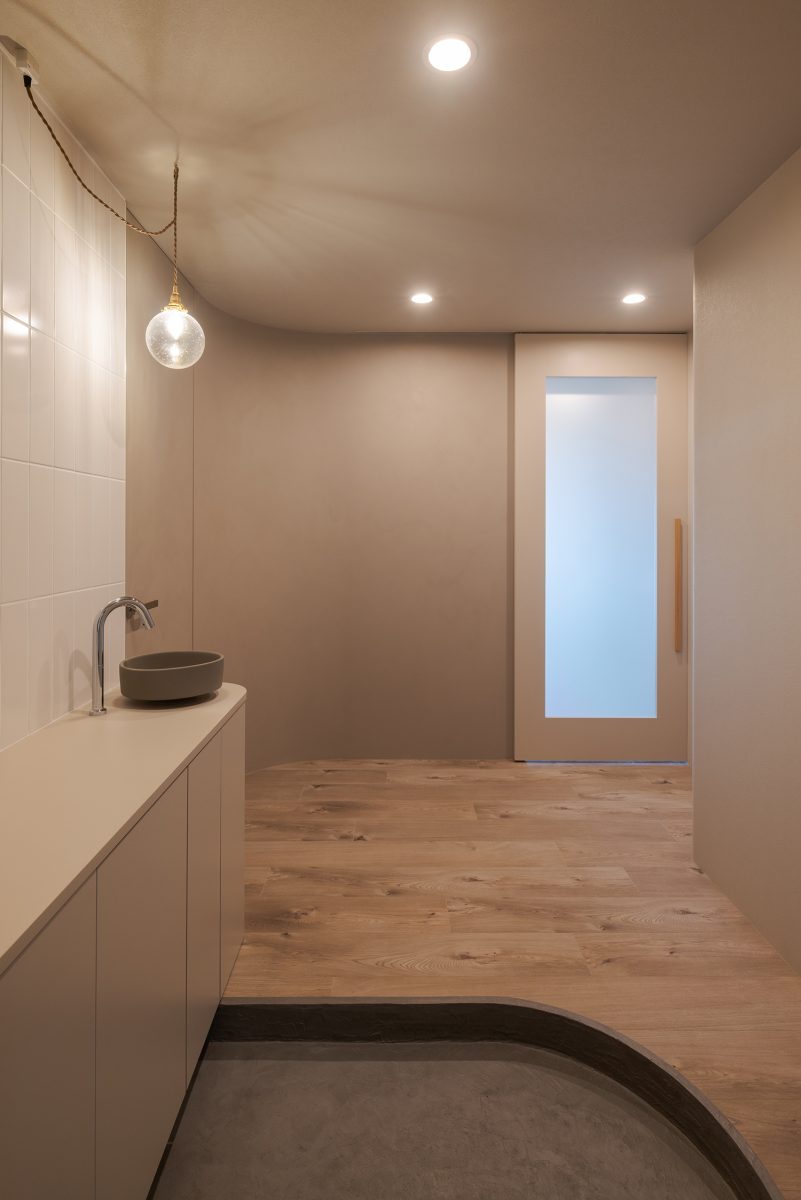 エントランスホールはアール壁だけでなく、小さな手洗いボウルや框(かまち)にも曲線を配し、やわらかな雰囲気に仕上げています。